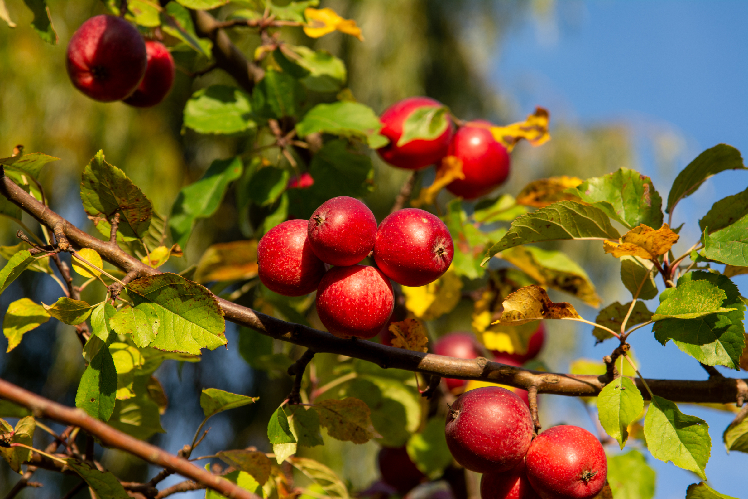Knallrote Äpfel am Baum in der Herbstsonne vor blauem Himmel
