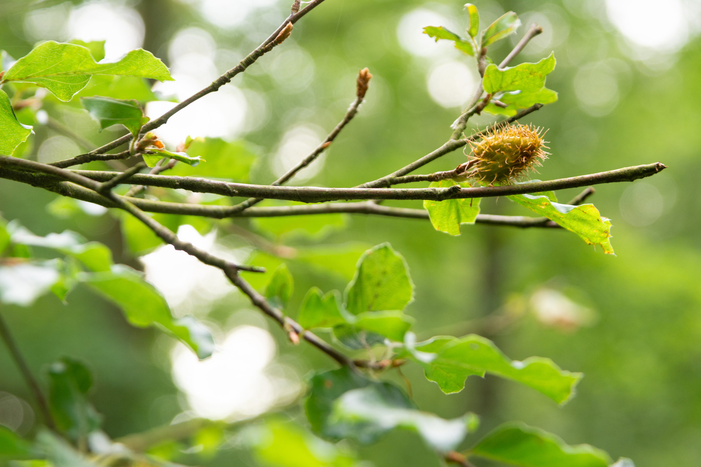 Eine Buchnuss mit ihren stacheligen Fruchthüllen an einem Zweig. Der Hintergrund besteht aus grünem Blattwerk anderer Laubbäume, das aber vollkommen in Unschärfe zerfließt, aber durch die Mischung von hellgrünen Flecken und weißen Bokeh-Kreisen den Eindruck eines dichten Waldes an einem sonnigen Tag vermittelt.