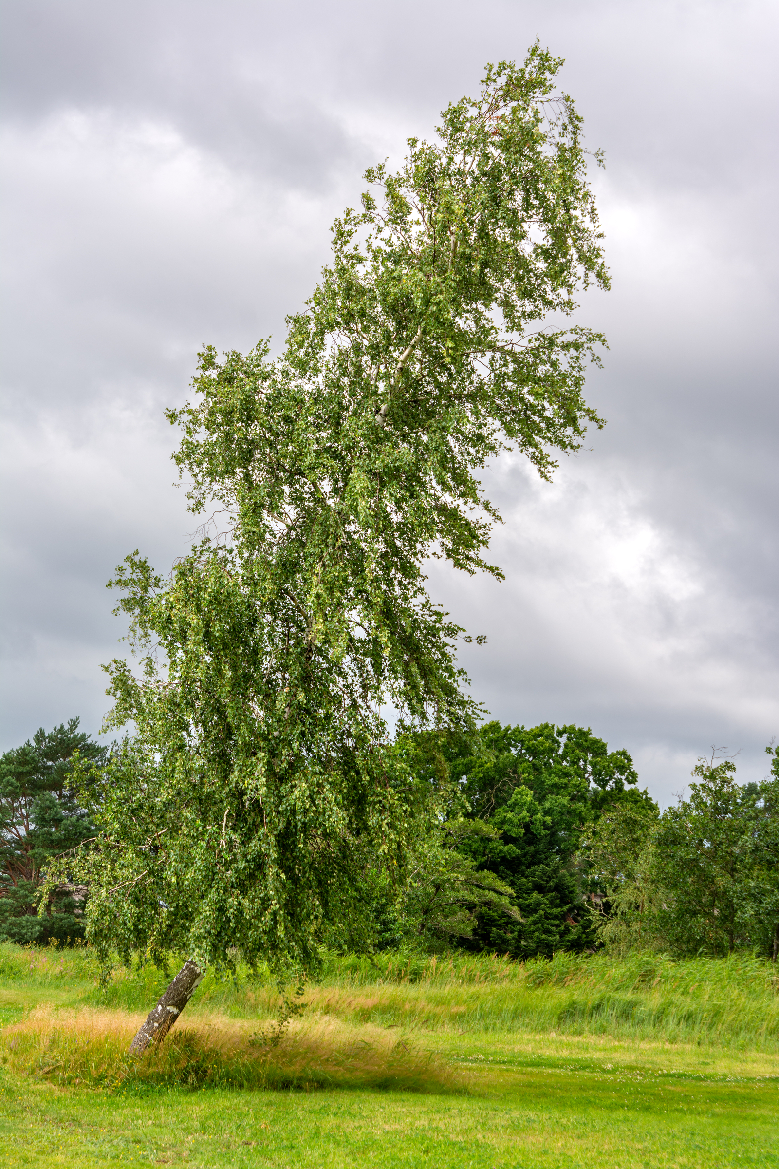 Birke auf einer Wiese, von Wind und Sturm geneigt