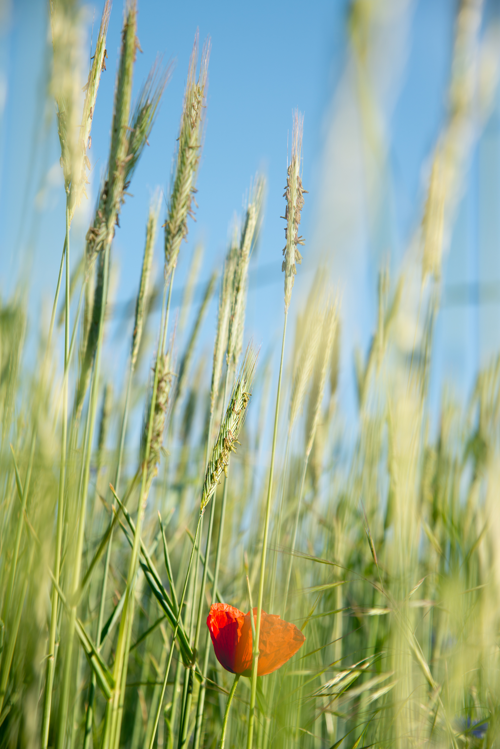 Das Bild ›Blühende8838‹ ist – zum Vergleich – dasselbe Motiv mit großer (offenerer) Blende. Anders als dort ist hier nicht nur die Tiefenschärfe größer, sondern alle Kontraste sind von vornherein stärker und die Farben gesättigter: Die Halme erscheinen klarer wie auch die Ähren im Hintergrund vor dem blauen Himmel.
