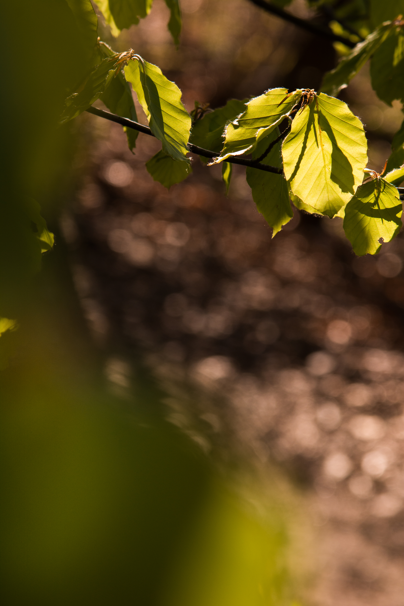 Buchenlaub vor unscharfem Waldboden mit Sonnenflecken