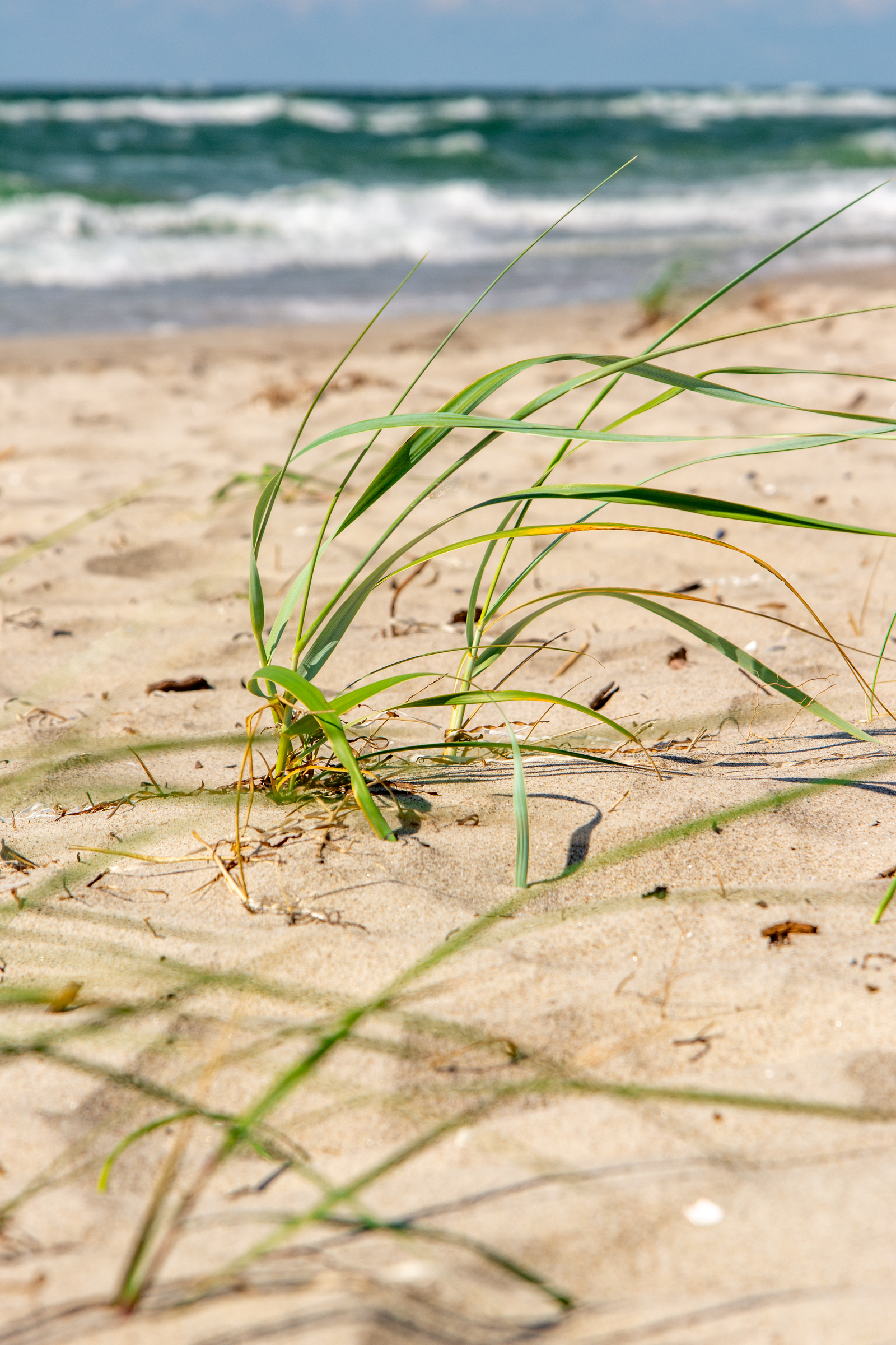 Im Mittelpunkt dieses Bildes steht ein einzelnes Büschel Dünengras, das auf einem sonnigen, feinsandigen Strand wächst. Die langen, grünen Halme des Grases biegen sich im Wind und werfen Schatten auf den Sand. Im Hintergrund sieht man die blau-grüne Ostsee, an der die Wellen mit weißen Schaumkronen brechen und unaufhörlich auf den Strand rollen.