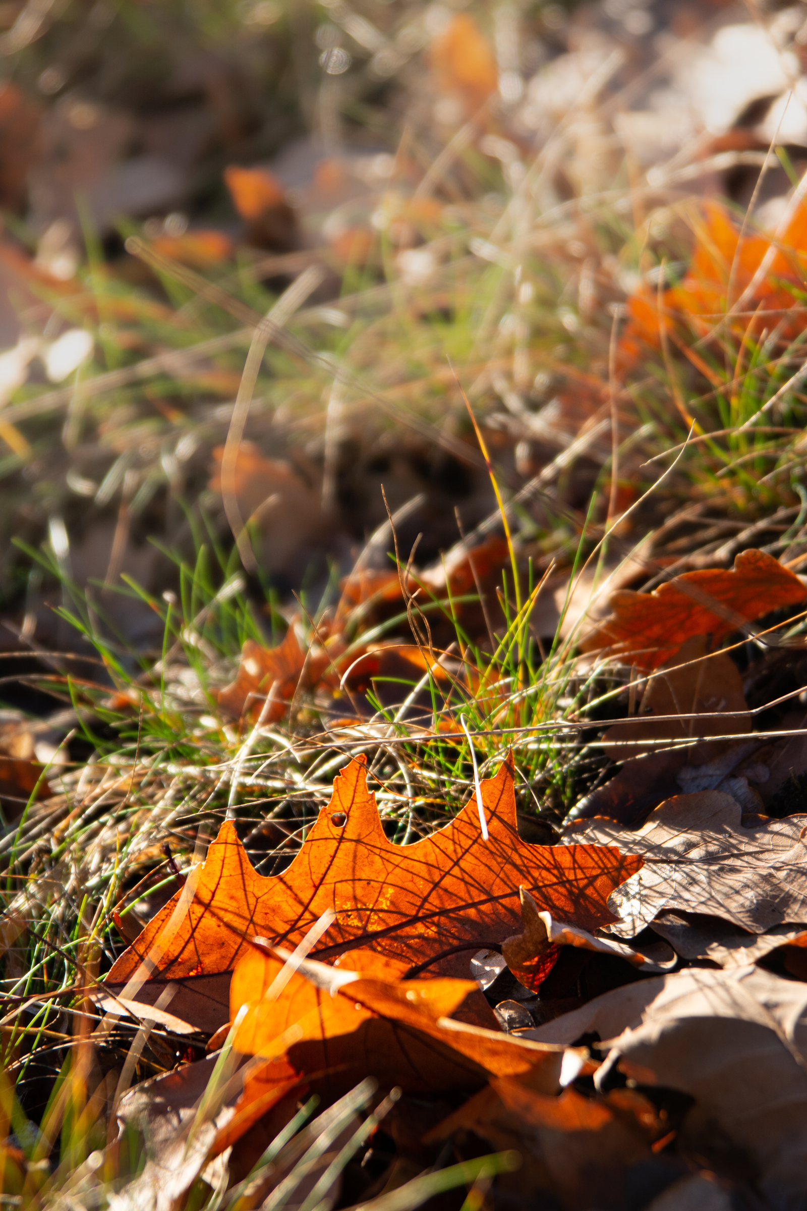 Eichenblätter im kaum noch grünen Gras im Gegenlicht