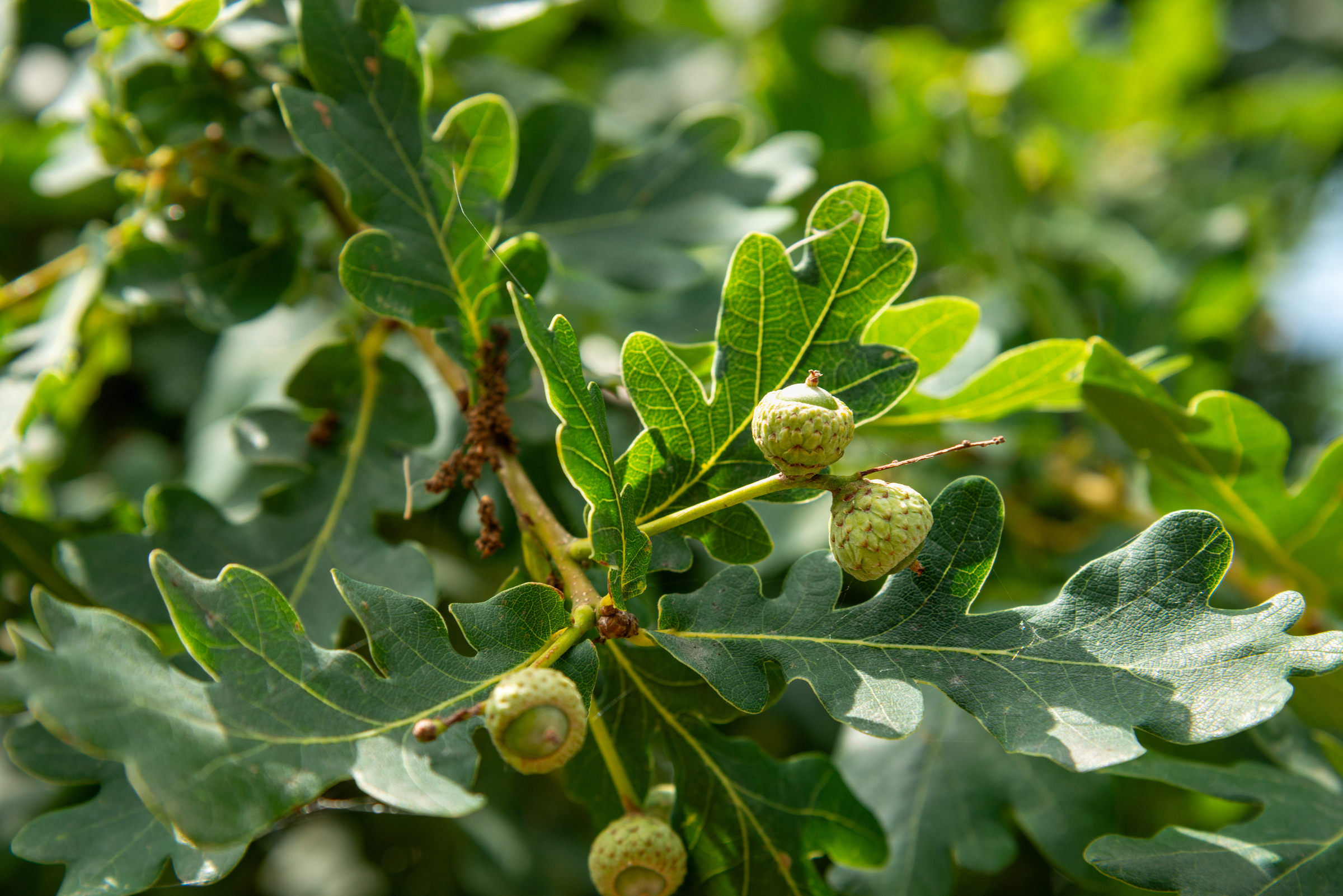 Eichenast mit jungen, unreifen Eicheln, die aufrecht auf den Zweigen sitzen. Die charakteristisch tief gelappten Eichenblätter umrahmen die Fruchtansätze in einem frischen Grün. Der Hintergrund verschwimmt zu einem Meer aus diffusen, grünen Lichtern. Es gibt subtile Highlights auf den Blättern und Früchten.