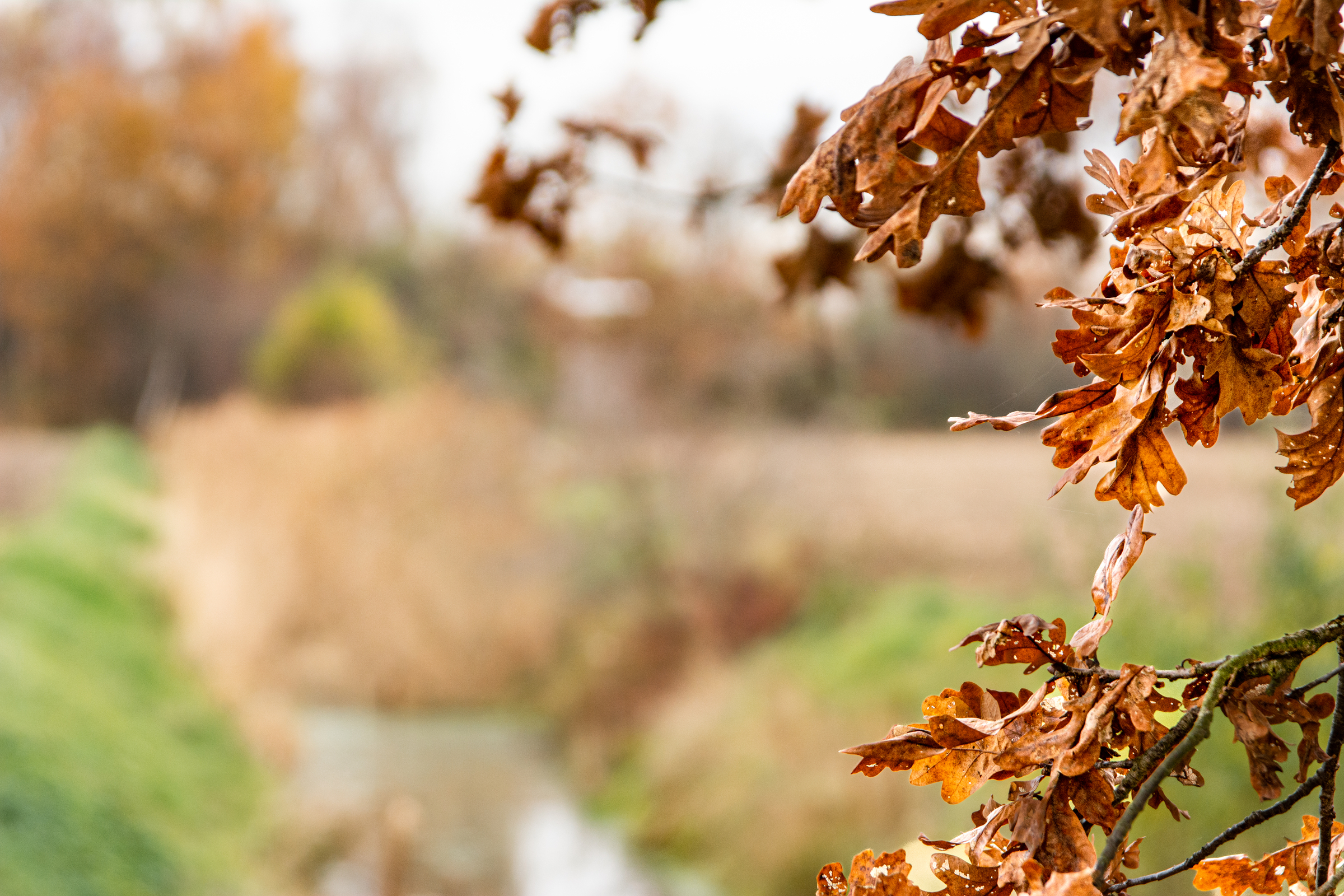 Eichenlaub an einem Zweig vor einem herbstlichen Feld mit Wassergraben im Hintergrund
