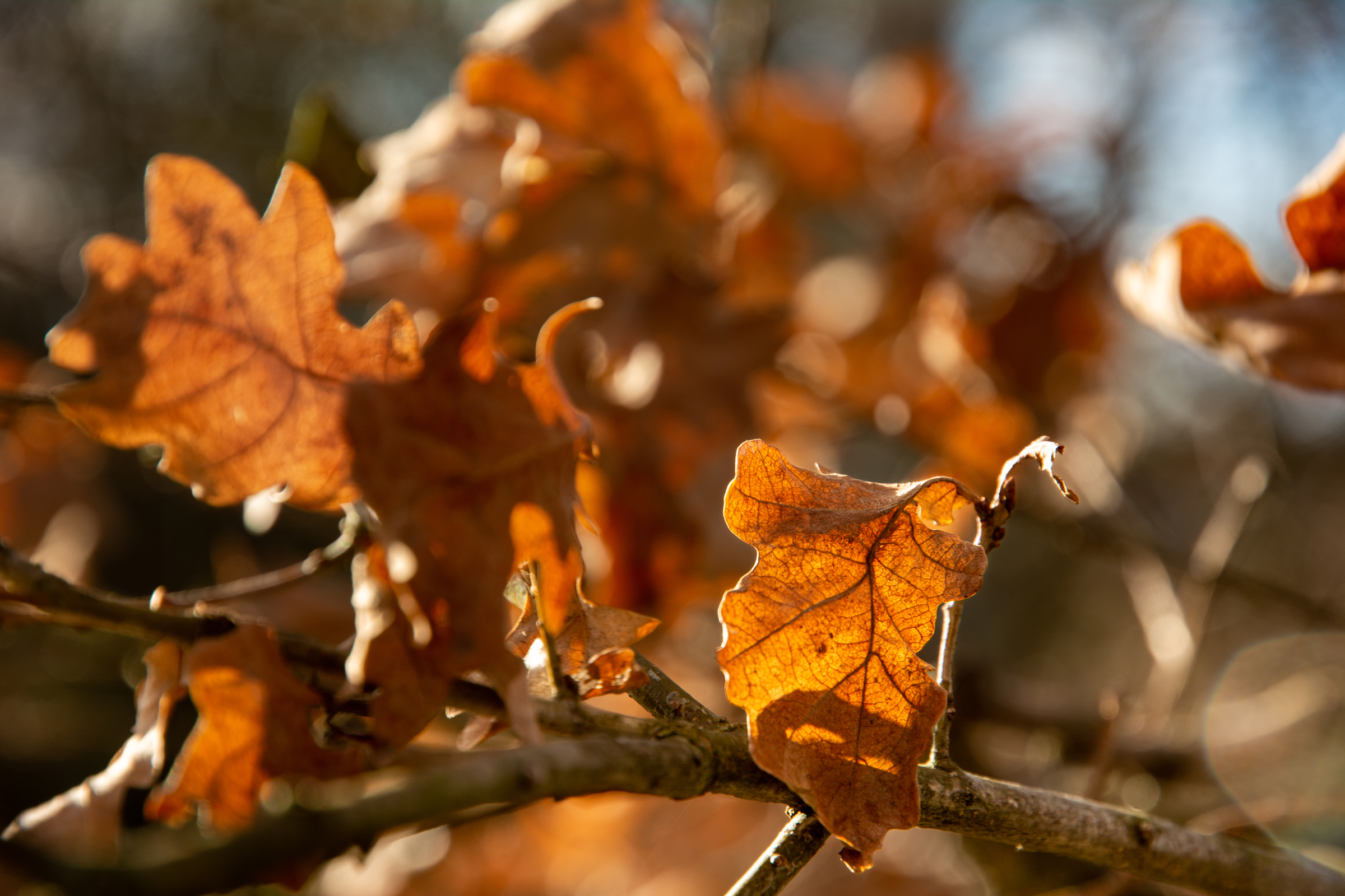 Eichenlaub an einem Ast im Gegenlicht Anfang Februar
