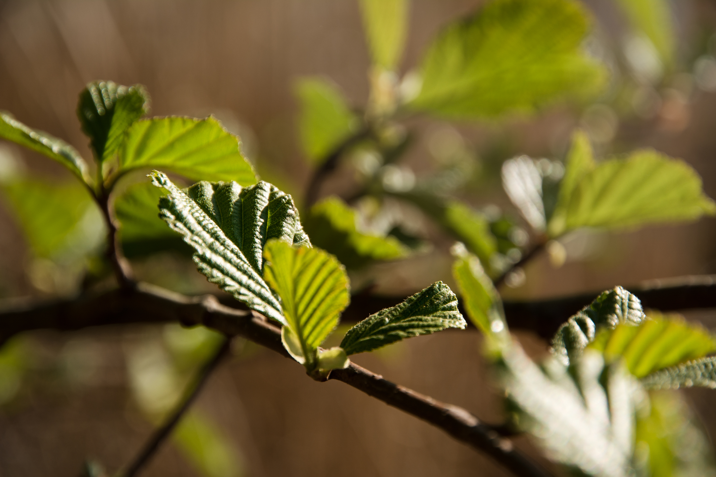 Frische Blätter einer Erle; weitere Zweige mit Blattwerk unscharf im Hintergrund; das Grün hat sich erst vor Kurzem entfaltet.