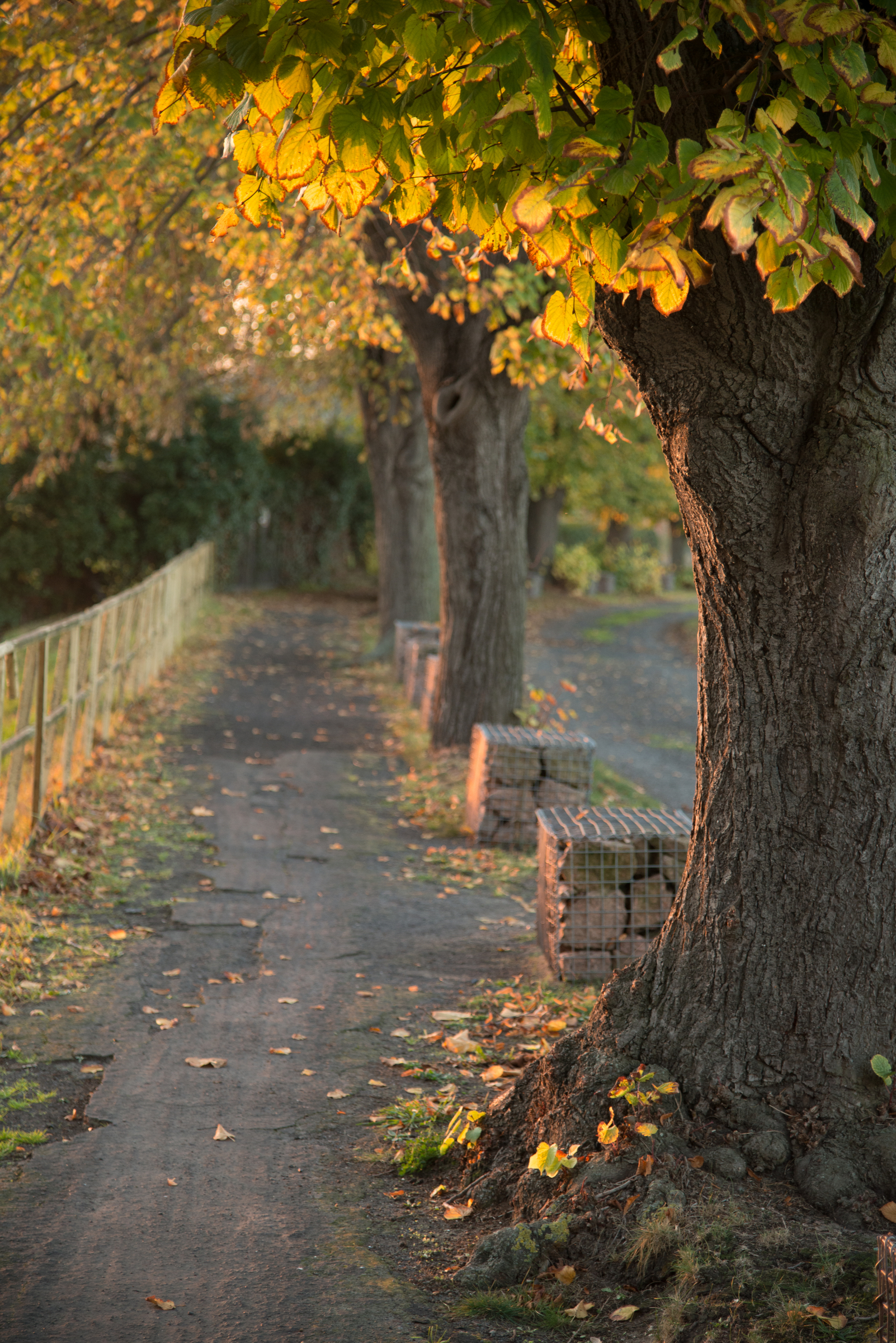 Fußweg entlang einer Reihe von Linden im abendlichen Gegenlicht