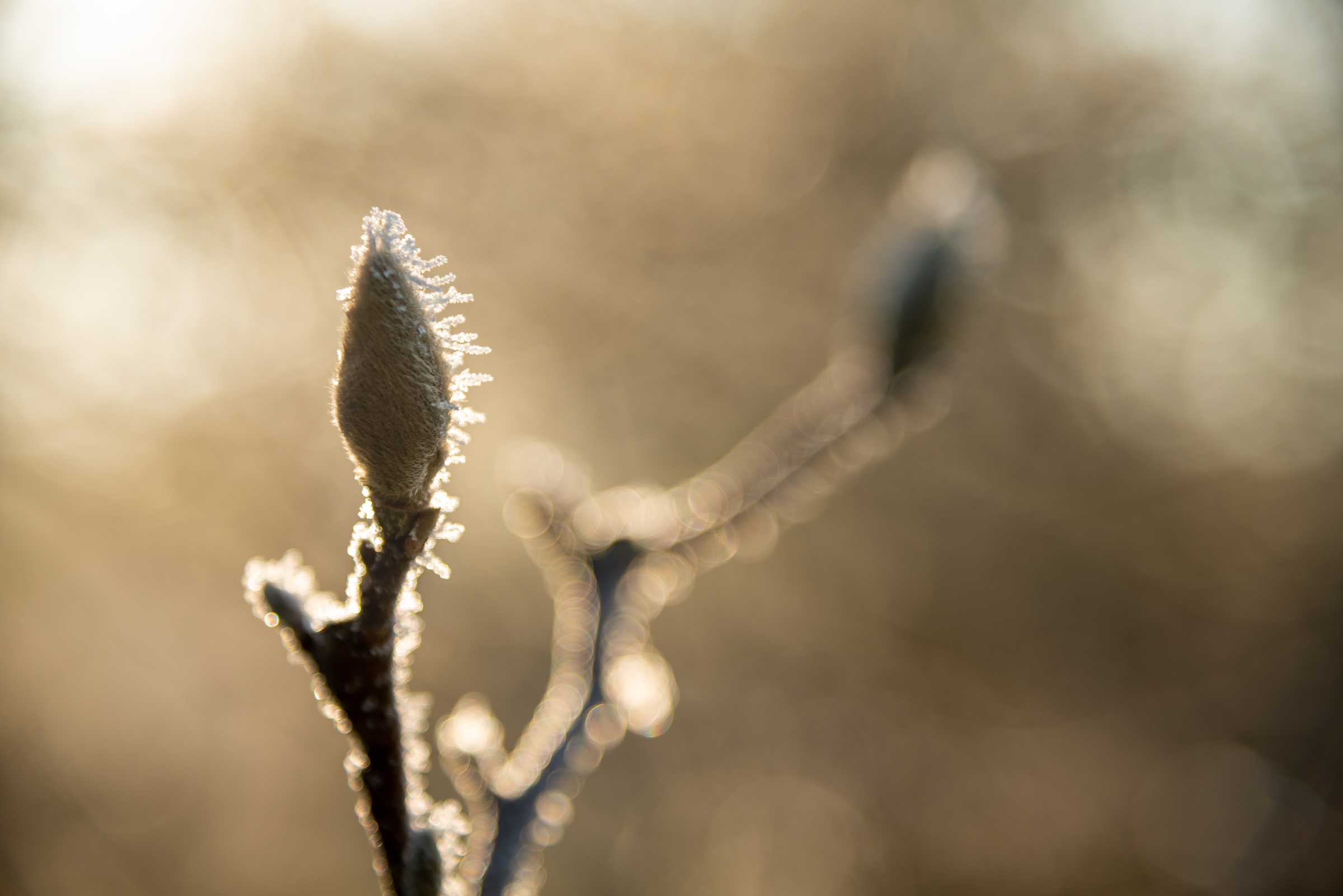 Magnolienknospe mit Raureif überzogen im Gegenlicht Magnolienknospe8192