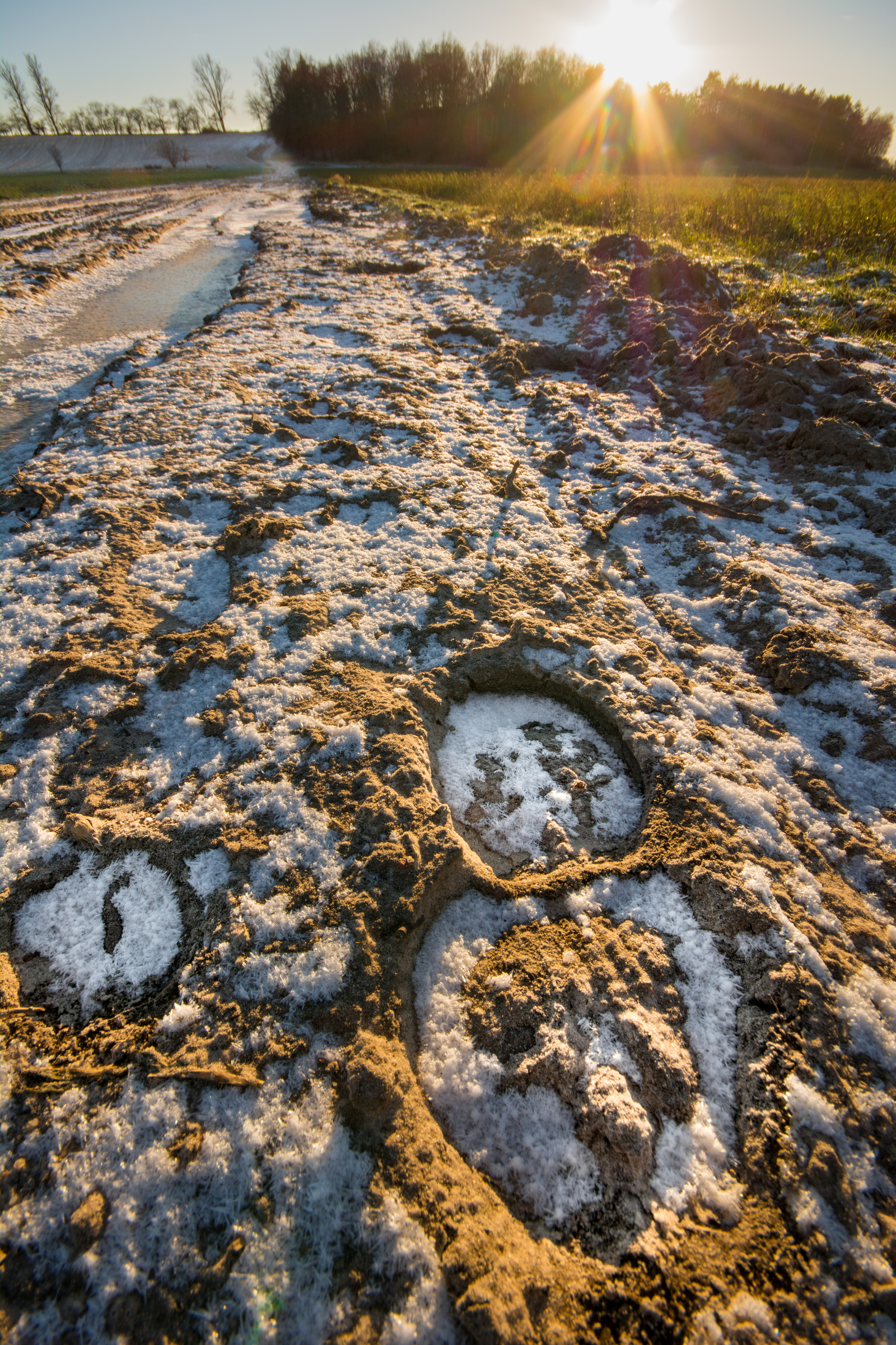In den Abdrücken der Hufeisen liegt ein wenig Schnee, etwas weiter hinten ist eine gefrorene Pfütze zu erkenne und durch die Baumreihe im Hintergrund bricht die Sonne und erzeugt direktes Gegenlicht.