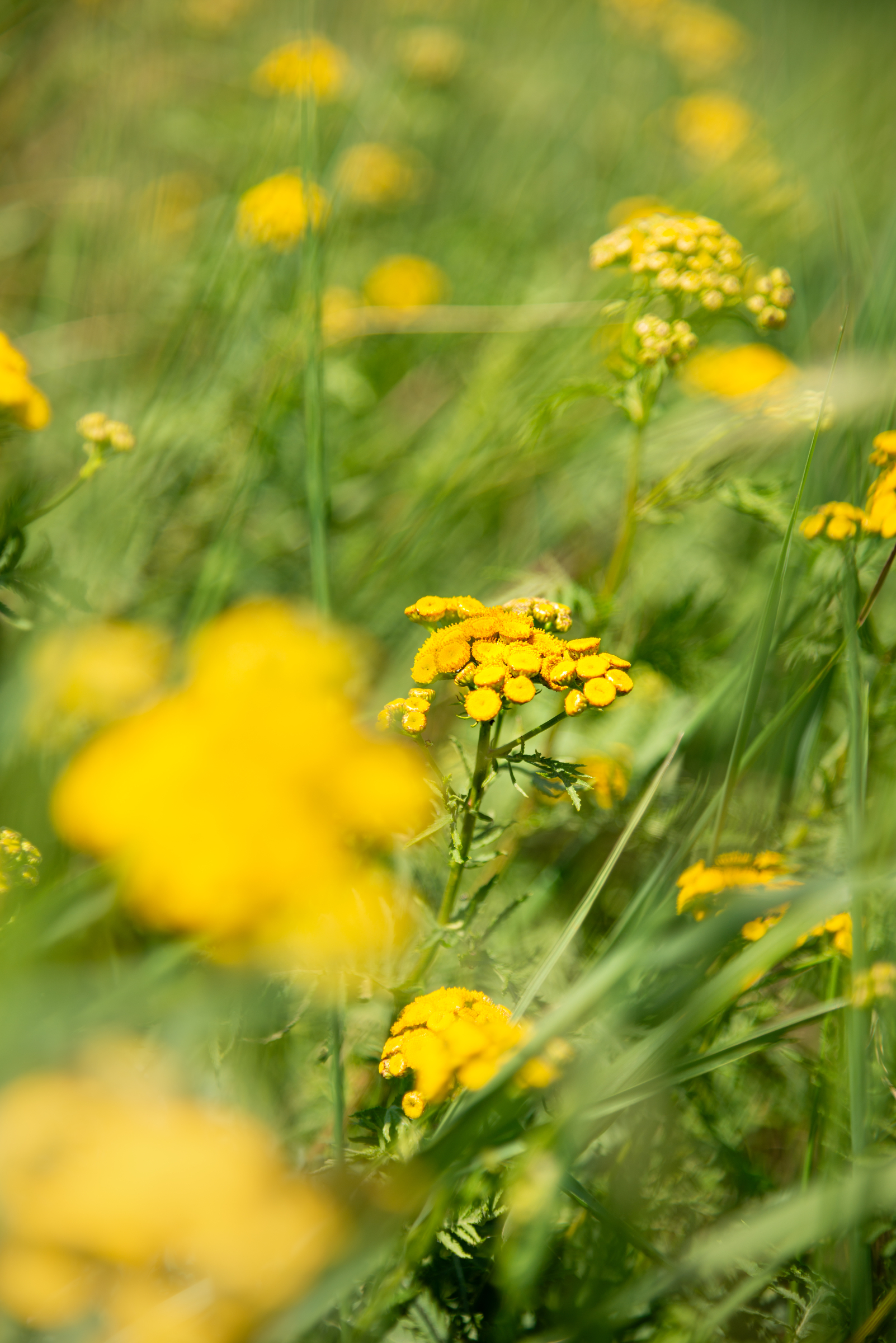 Im Vordergrund steht eine Gruppe von Rainfarnblüten (Tanacetum vulgare), deren kräftig gelbe Blütenköpfe von den umliegenden Pflanzen sanft umspielt werden. Der Fokus liegt auf einer Blüte, die sich klar von der verschwommenen Umgebung abhebt. Der Rest des Bildes ist von einem Meer aus gelben Blüten und grünem Gras geprägt. Die Blumen im Vordergrund erscheinen fast schwebend, weil sie sich wie gelbe Wolken in die Perspektive des Betrachters schieben.