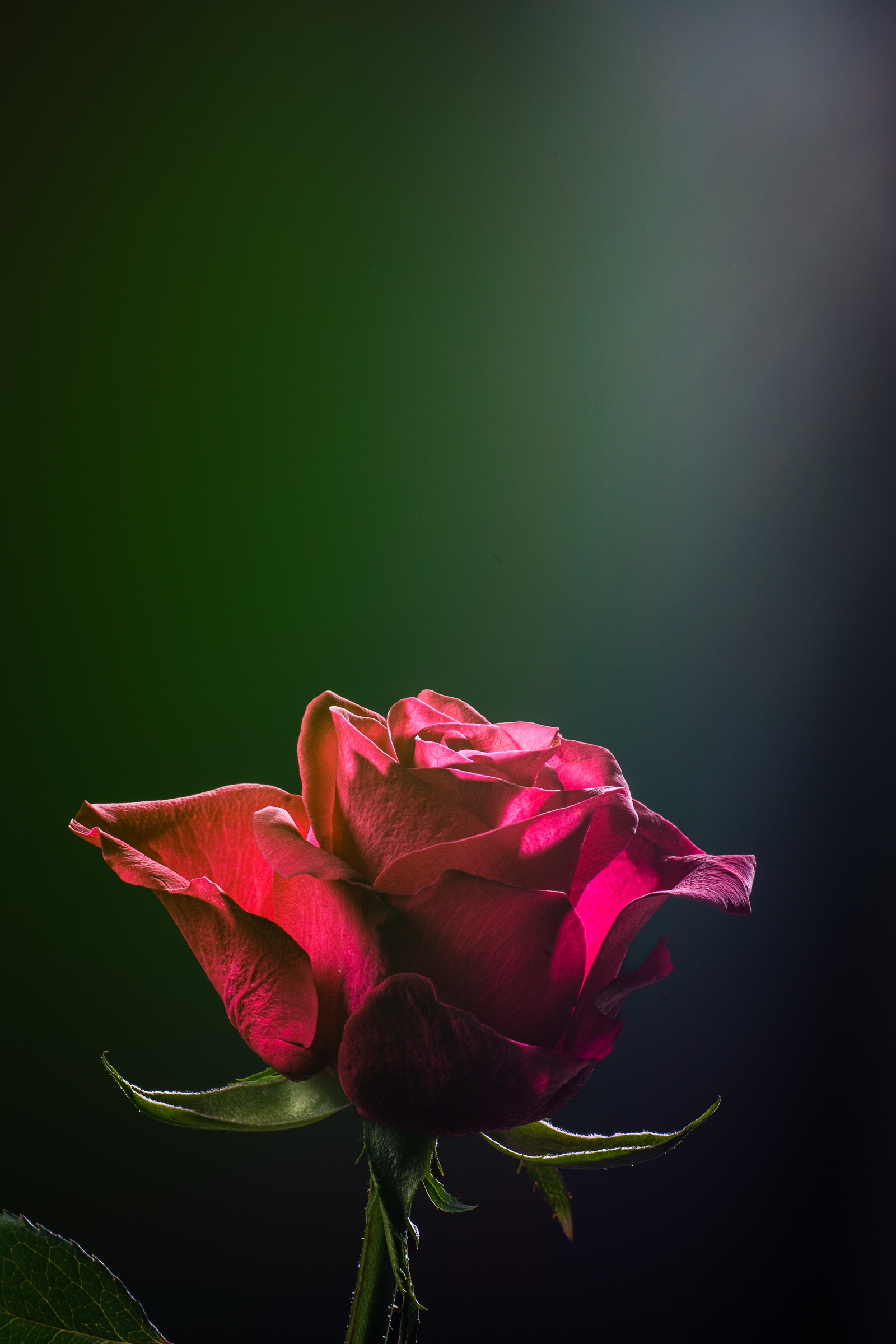 Porträt einer roten Rose, die von einem grellen Licht angestrahlt wird; Bild bietet Raum, um ggf. Text darin zu platzieren