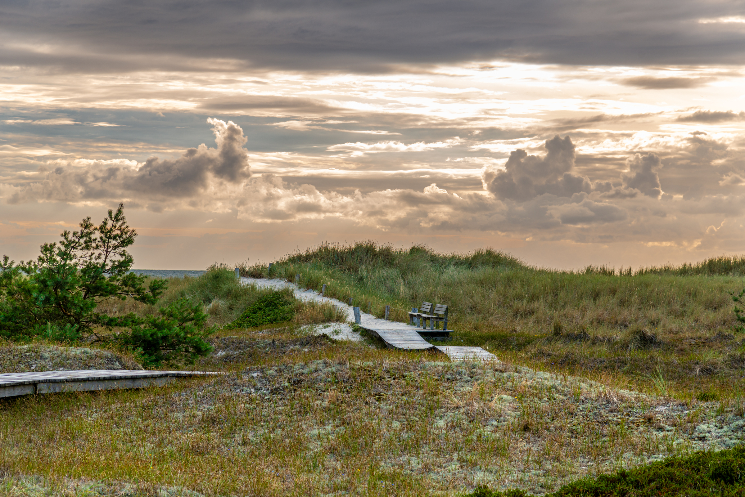 Ein einsamer Bohlenweg schlängelt sich durch die hügeligen Dünen und führt zu einer einsamen Bank auf einer kleinen Anhöhe. Im Vordergrund sind Gräser und Moosflechten zu erkennen, die den Sand der Dünen mit Vegetation bedecken; weiter hinten finden sich buschartige Kiefern. Der Himmel im Hintergrund zeigt dramatische Wolkenformationen, die in warmes Abendlicht getaucht sind. Die Sonnenstrahlen brechen durch die Wolken und erleuchten den Himmel in sanften Gold- und Orangetönen.