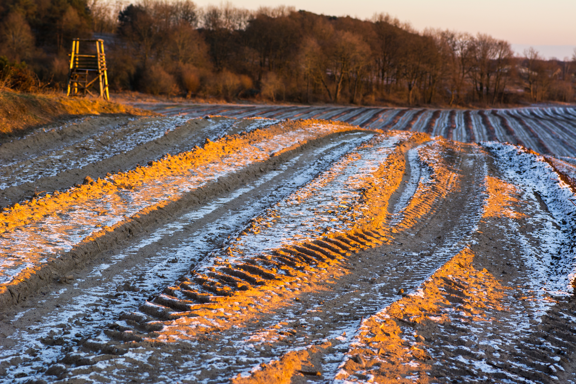 Traktorspur glüht rotgolden, weil sie und andere Furchen des Feldes von einer tief stehenden Nachmittagssonne touchiert werden