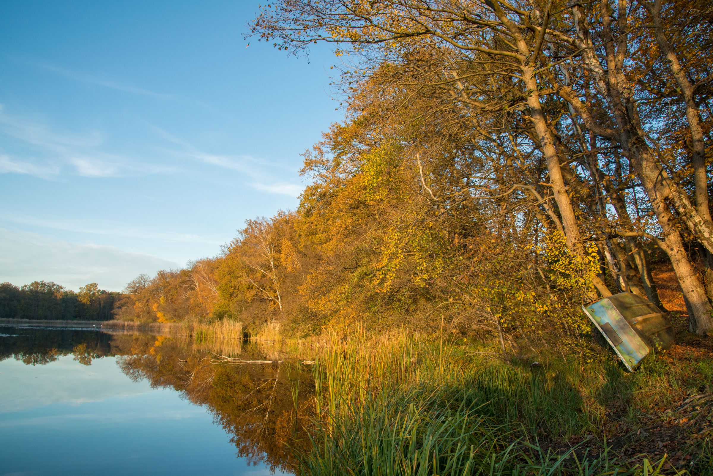 Ufer des Bohnenländer Sees in der Abendsonne bei strahlend blauem Himmel