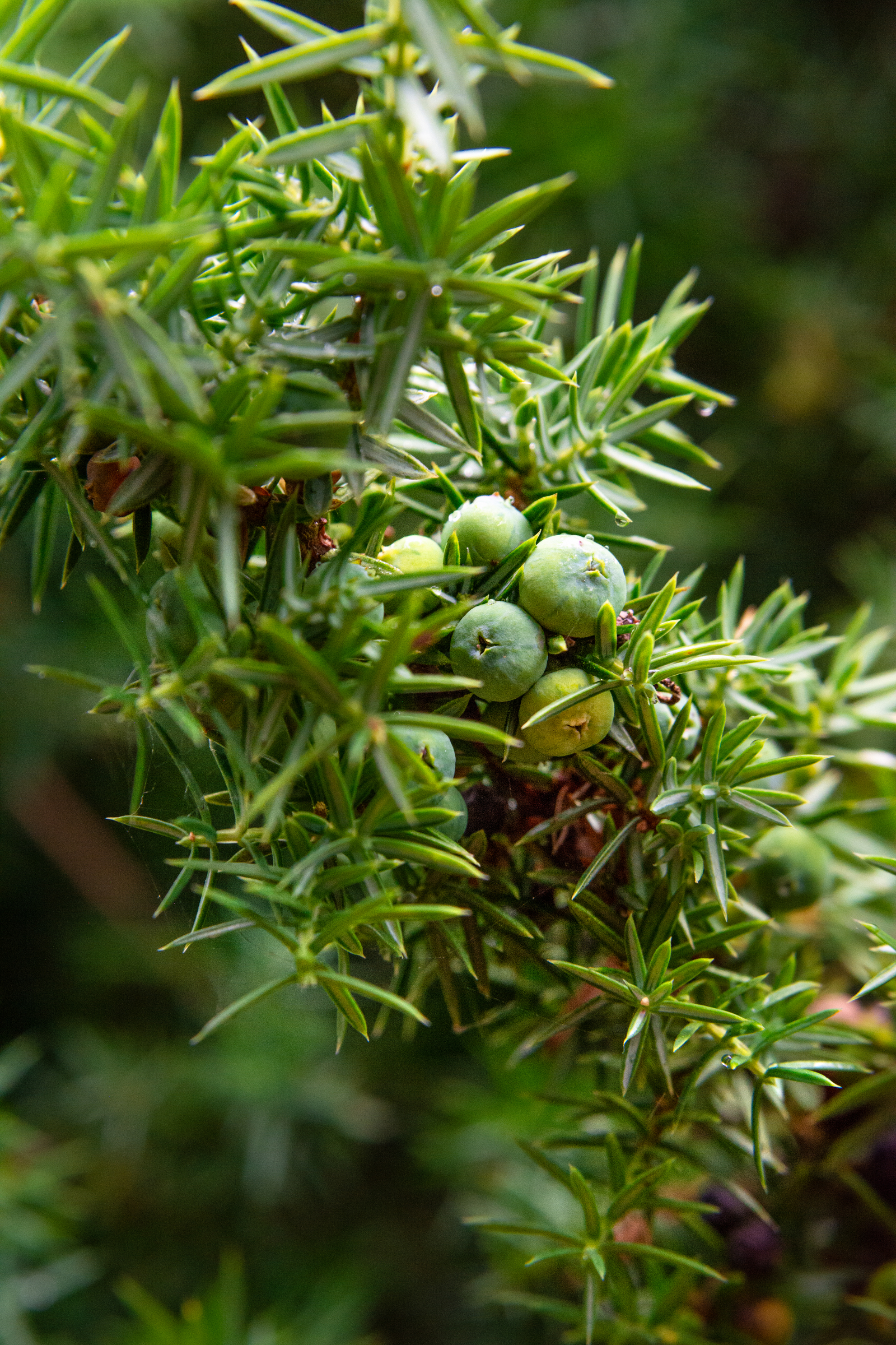 Nahaufnahme von Wacholderbeeren, die noch hellgrün sind, weiche Unschärfe im Hintergrund, natürliches Licht, dichte Nadeln.