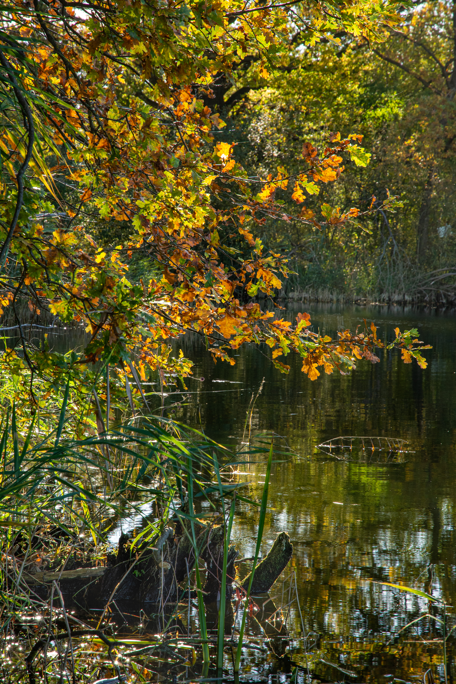Das Bild zeigt den hochformatigen Ausschnitt eines Fischteichs, der gänzlich von Bäumen umsäumt ist. Es gibt Schilf am Ufer und Totholz im Wasser, dessen Oberfläche aber ruhig ist. Das Gegenlicht verleiht der Szene Lebendigkeit.