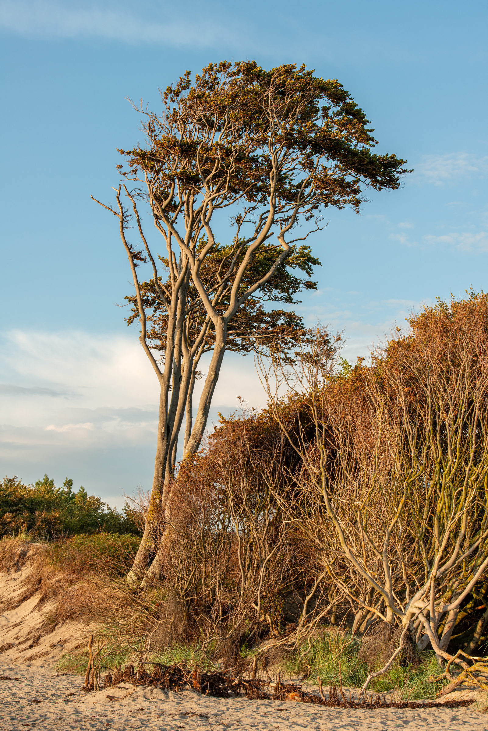 Diese Aufnahme zeigt die charakteristischen, windgeformten Buchen am Weststrand des Darß (Windflüchter). Ihre verwundenen Stämme und spärlich belaubten Äste ragen hoch in den blauen Himmel und zeugen von den Kräften der Natur, denen sie ausgesetzt sind. Im Vordergrund verläuft eine sandige Küste, während niedrige Sträucher und Büsche am Fuß der Buchen eine natürliche Grenze bilden. Die Abendsonne taucht die Szene in warmes Licht und hebt die goldbraunen Farbtöne des Grases und der Baumrinde hervor.