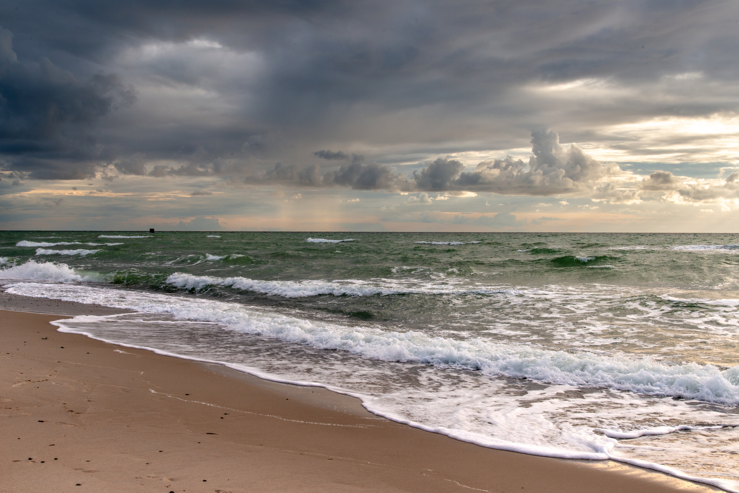 Wellen rollen an das Ufer über den Sand, während sich im Hintergrund eine dramatische Wolkenformation am Himmel abzeichnet. Das Meer schimmert in tiefen Grüntönen, der Himmel ist bedeckt mit dunklen Wolken, während vereinzelte Lichtstrahlen durch die Wolkendecke dringen und die Szene in ein geheimnisvolles Licht tauchen.